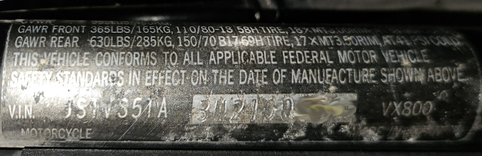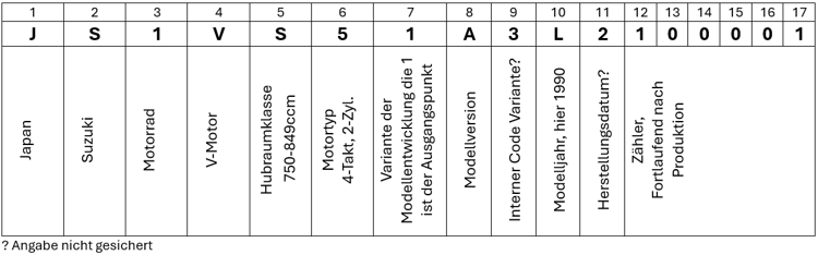Für die VX800 kommen je nach Land zwei verschiedene Fahrzeugidentifikationsnummern (Vehicle Identification Number VIN), umgangssprachlich auch Fahrgestellnummern zur Anwendung. Die z.B. in Australien und nach unseren Infos nur bei der VS 51A verwendete 17-stellige Langversion (beginnend mit JS1) enthält viele Informationen, die sich dank der Webseite gs-classic.de fast vollständig aufschlüsseln lassen. Demnach bedeutet beispielsweise JS1VS51A3L2100001 Folgendes: